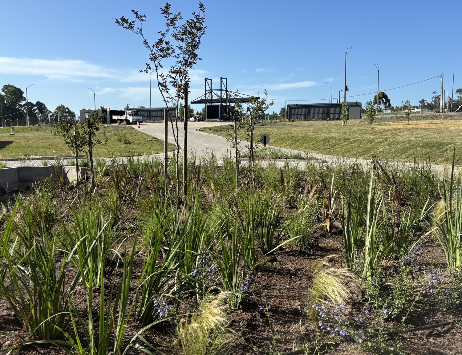 Proyecto y obra realizada Noviembre -Diciembre 2024 Ubicado al oeste de Montevideo, en una zona semi rural sobre la ruta perimetral, el proyecto de Paisajismo Club Cash representó un desafío y, al mismo tiempo, una gran oportunidad de diseño. Fuimos convocados a participar de este proyecto ambicioso, donde el paisaje tenía un rol clave: acompañar, jerarquizar y dar identidad al edificio, entendiendo el entorno y sus condiciones reales. El punto de partida: leer el sitio Si bien el suelo no correspondía al suelo original del lugar, entendimos que esto no era una limitante, sino una posibilidad. A partir de esa condición inicial, trabajamos en repensar el territorio, valorando el contexto y proyectando un paisaje capaz de evolucionar en el tiempo. El diseño se apoyó en una mirada sensible y estratégica: crear un sistema vegetal resiliente, que dialogara con la arquitectura y con el paisaje semi rural circundante. Un parque nativo en crecimiento La propuesta paisajística dio lugar a un parque nativo, hoy en pleno desarrollo. La selección de especies priorizó la diversidad, la adaptabilidad y el bajo mantenimiento, permitiendo que cada planta exprese su forma, textura y ritmo natural. Los canteros, mayoritariamente compuestos por especies nativas, generan un entorno vivo y dinámico, que cambia con las estaciones y acompaña el uso cotidiano del espacio. Paisaje que acompaña y resalta Lejos de competir con el edificio, el paisaje fue pensado para realzar su presencia, suavizar escalas y construir transiciones entre lo construido y lo natural. El resultado es un conjunto equilibrado, donde arquitectura y vegetación se potencian mutuamente. Este proyecto reafirma nuestra convicción: el paisajismo no es un complemento, sino una parte esencial del proyecto. Hoy, el Paisajismo Club Cash continúa creciendo, consolidándose como un ejemplo de cómo el diseño consciente puede generar espacios funcionales, estéticos y profundamente conectados con su entorno.